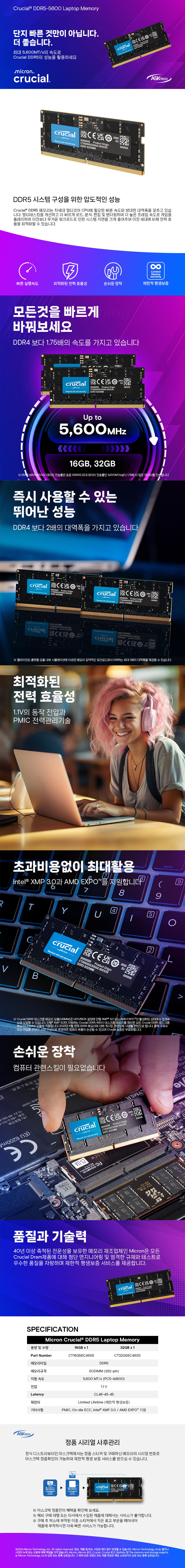 16GB / 32GB A/S 보증기간 Limited Lifetime (제한적 평생보증) CT16G56C46S5 / CT32G56C46S5