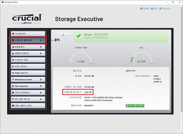 - SSD 의 TBW 확인 방법은 마이크론에서 제공하는 Storage Executive 소프트 웨어로 확인 가능합니다.
